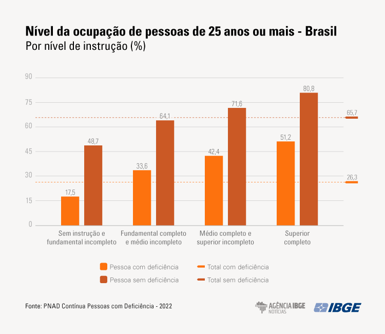 51,2% das pessoas com deficiência que tinham nível superior estavam ocupadas. A analista do IBGE destaca: “os dados mostraram que o nível de ocupação das pessoas com deficiência foi sempre inferior ao das pessoas sem deficiência, ainda que no mesmo nível de instrução”. E mesmo com estudo mais da metade (55,0%) dos ocupados com deficiência eram trabalhadores informais.